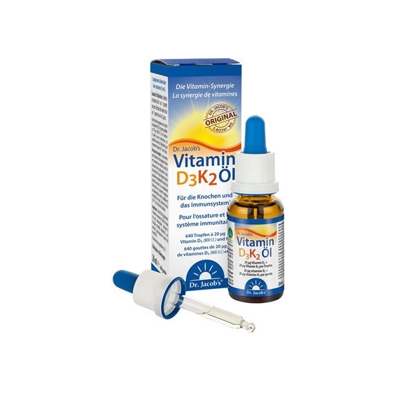 Nicht nur Vitamin D3 trägt zur Erhaltung normaler Knochen bei, sondern auch Vitamin K2. Beide wirken synergistisch und sollten am besten kombiniert aufgenommen werden wie in Dr. Jacob’s Vitamin D3K2 Öl, Dr. Jacob’s Vitamin D3K2 Öl forte, Dr. Jacob’s Vitamin K2D3 Öl (bei erhöhtem Vitamin-K2-Bedarf) und Dr. Jacob’s Vitamin DEKA Öl (mit Vitamin A und E als natürliche Tocopherole).